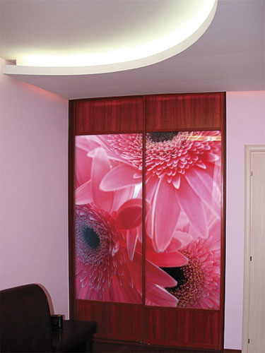 - Глянцевые. На подготовленную поверхность фасада наносится пластик, акрил или ПВХ плёнка любого цвета. Благодаря низкой стоимости данных материалов, получается недорогой шкаф–купе, украшающий комнату.
